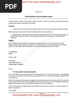 Cbse Class 12 English Letter Writing Letter Of Enquiry And Reply