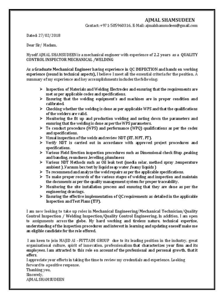 Cover Letter Mechanical Engineering Nondestructive Testing